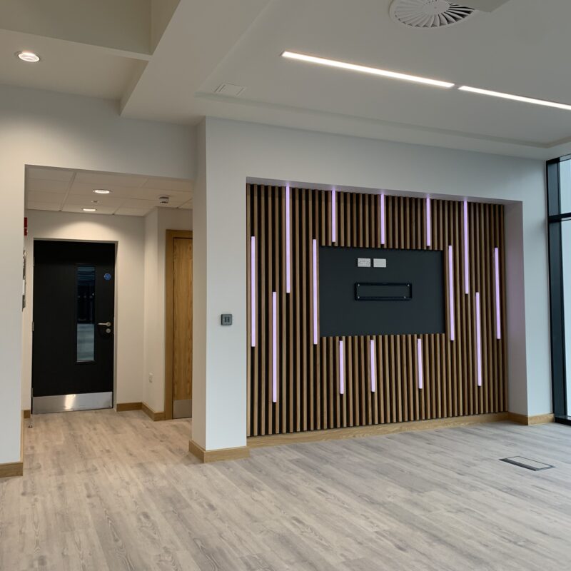 As well as American white oak joinery and doors, finishing touches also include kitchens with contrasting colours to base and wall units, accentuated by Silestone work surfaces and glass splashbacks. Typical Indurent design features are prominent in the reception areas, carrying a thread of continuity from previous contracts in Derby and Tamworth. These features include custom made oak slats spaced to accept colourful strip lighting and a wall mounted TV, which creates an eye catching feature wall at the office entrance point.