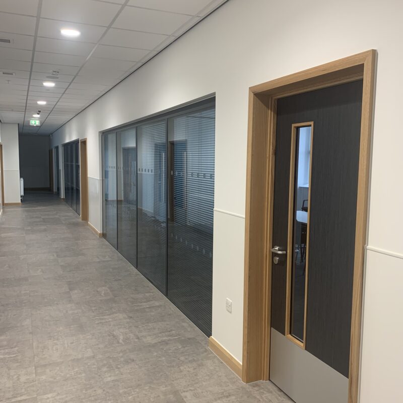 High-specification finishes featured décor slat oak slatted ceilings and Buzzigrid acoustic baffles, adding both visual interest and acoustic control. Planet glazed partitions were also installed to create modern, light-filled office and meeting areas.