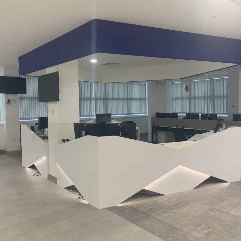 The project involved extensive bespoke joinery, including the manufacture and installation of multiple feature desks. These desks featured Corian-formed curved worktops, with end- user logos precisely machined into the Corian surfaces, highlighting the custom nature of the fit-out.